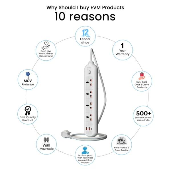 4-outlet power strip with 2xUSB and 1xType-C ports. 10A maximum current, 3-meter cable, MOV protection, fire-resistant material, and safety features including child lock shutters and overload protection.