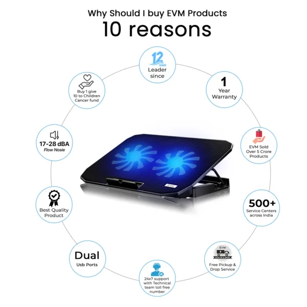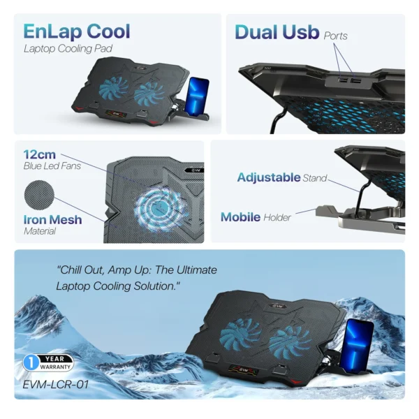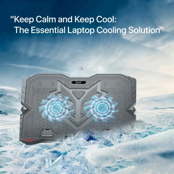 Dual-fan laptop cooling pad with two 125mm fans (1200 RPM). 47 CFM airflow, blue LED lighting, low noise (17-28 dBA), 5W power. Effective cooling solution for gaming and work laptops.