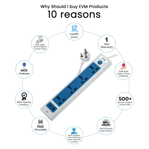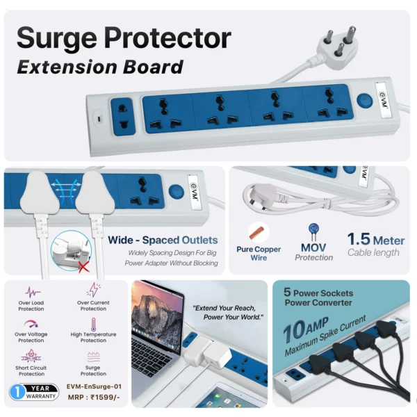 5-outlet power strip with 10A maximum spike current. Features MOV protection, master push button, fire-resistant material, LED indicator, child lock shutters, and overload protection. 1.5-meter power cable.