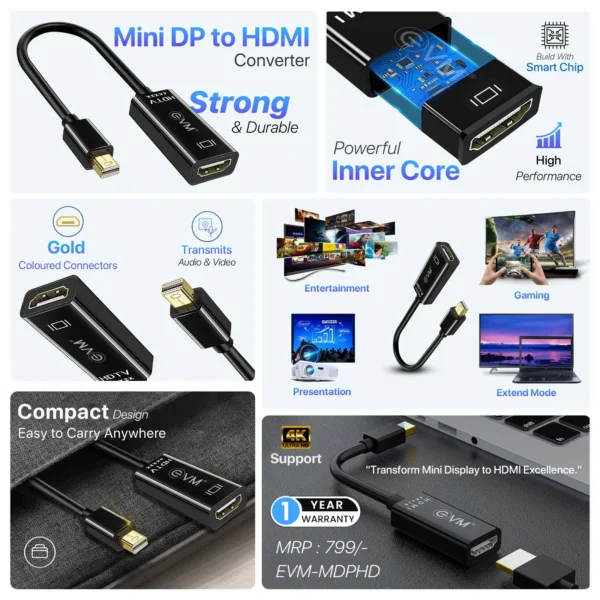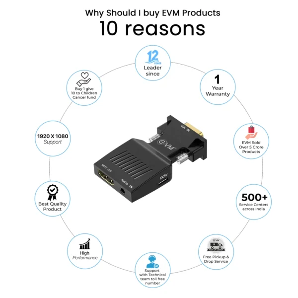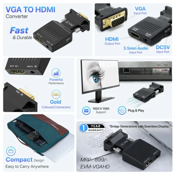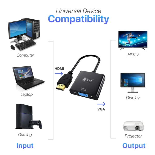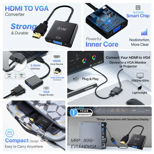 HDMI to 1080P adapter with 3.5mm audio output. Plug-and-play operation, universal compatibility. Gold-plated connectors ensure reliable signal transmission for audio and video.