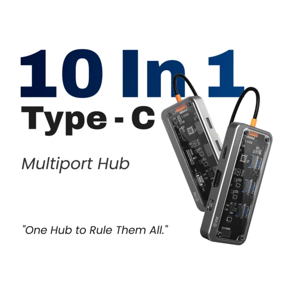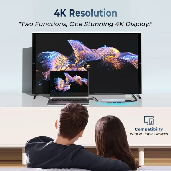 9-in-1 Type-C docking station with HDMI 4K, VGA 1080P, USB 3.0, 2xUSB 2.0, PD charging, RJ45 Ethernet, SD/TF card reader, and 3.5mm audio port. Comprehensive connectivity solution for office and home use.