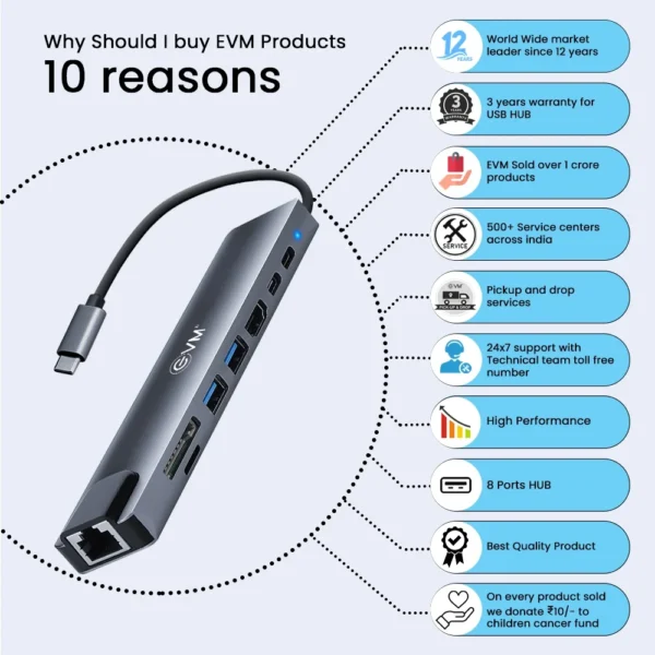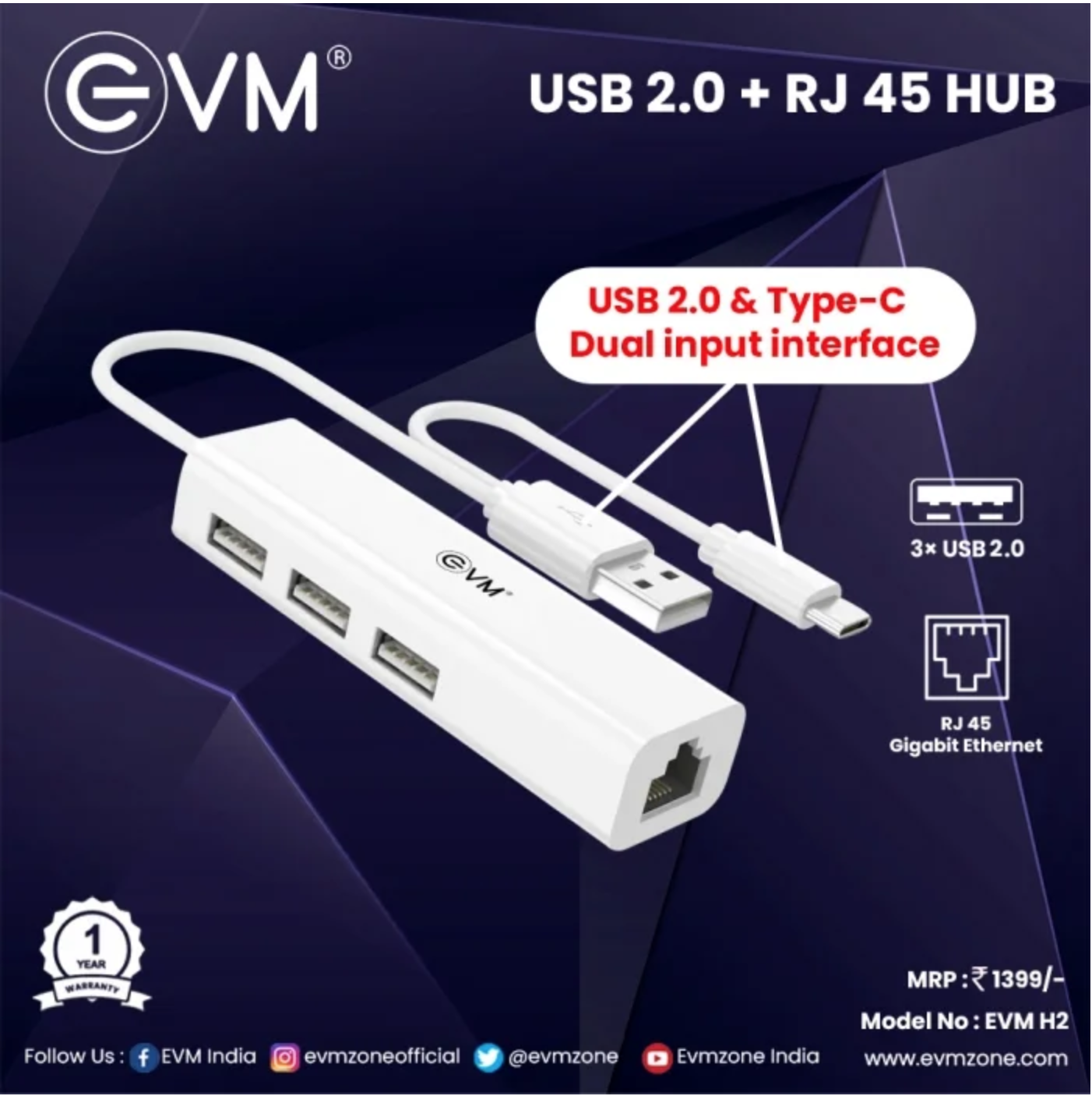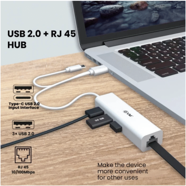 Dual-input (USB 2.0 + Type-C) to 3xUSB 2.0 and RJ45 Ethernet adapter (10/100Mbps). Bus-powered design, supports full and half-duplex transmission. Integrated Fast Ethernet MAC and transceiver in one chip.