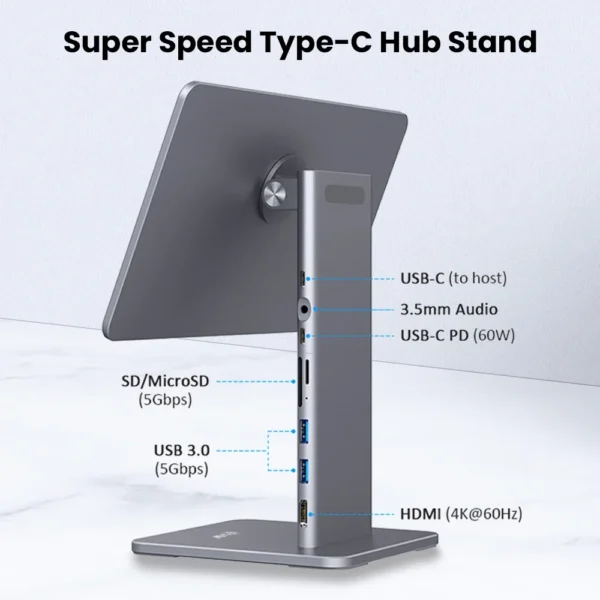 iPad Pro/Air docking station with PD 3.0 charging (60W), HDMI 4K@60Hz, 2xUSB 3.0, SD/micro SD card readers (1TB), and 3.5mm audio jack. Specifically designed for iPad Pro 2018/2020/2021 11".