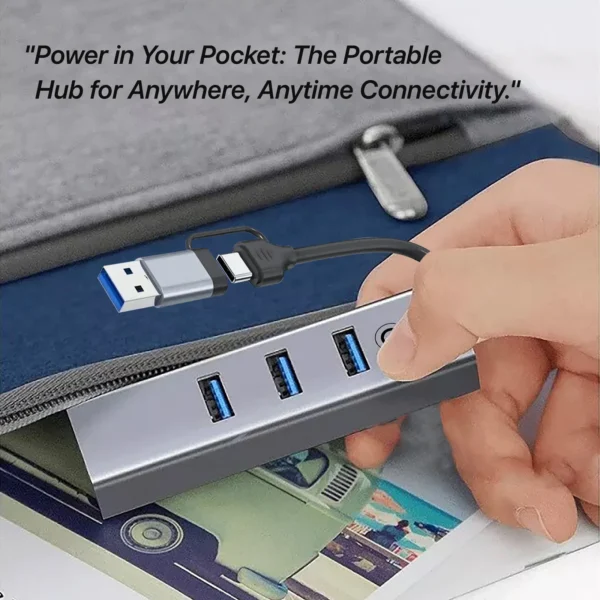 Dual-input Type-C & USB 3.0 hub with 1 USB 3.0 and 3 USB 2.0 ports. All-aluminum alloy body, plug-and-play, overload protection. Compatible with Windows and Mac systems. Fast data transfer up to 5Gbps.