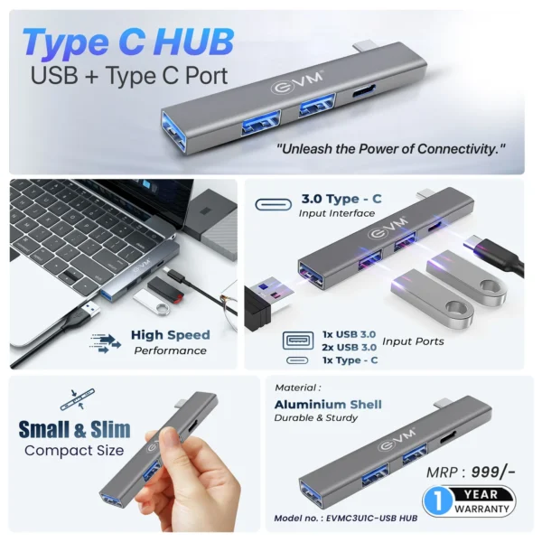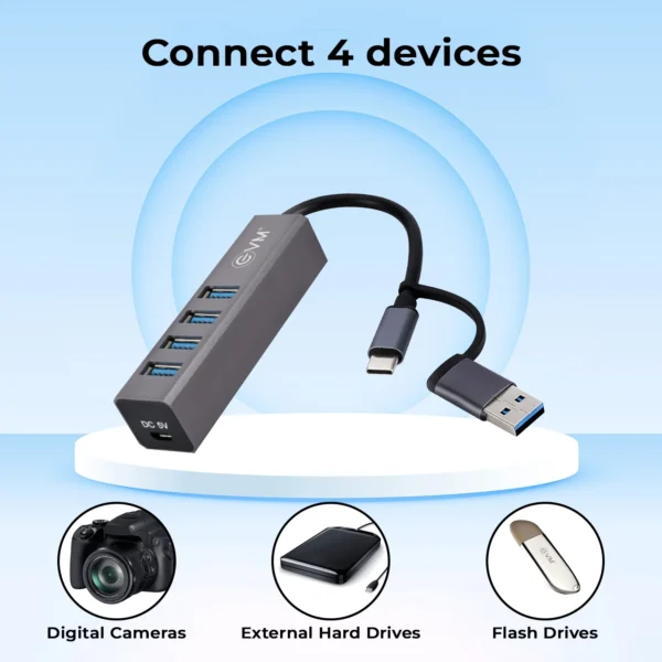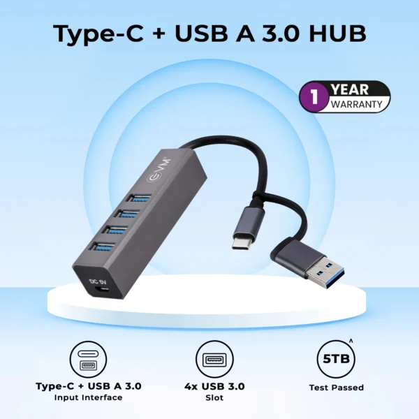 Dual-input 4-port USB 3.0 hub with Type-C and USB A 3.0 inputs. Data transfer up to 5Gbps, backward compatible with USB 2.0/1.1. Sleek aluminum casing with multi-protection circuit for device safety.