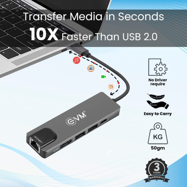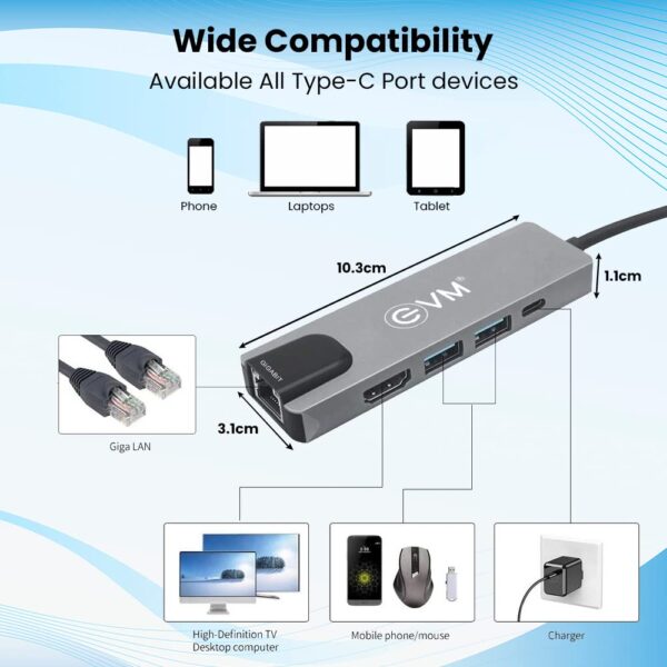 6-in-1 Type-C docking station with USB 3.0, 4K HDMI, Gigabit Ethernet, PD charging. Aluminum alloy construction, plug-and-play operation. All interfaces work simultaneously. Compatible with MacBook, iPad Pro, and other Type-C devices.