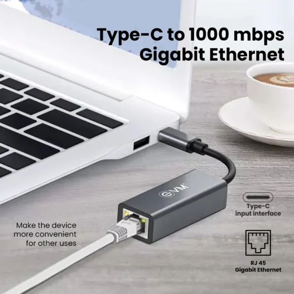 Type-C to Gigabit Ethernet network card. Supports 10/100/1000Mbps auto-negotiation, plug-and-play with built-in drivers. Compatible with Windows, Mac, Linux, Android. Features auto MDIX and remote wake-up capability.