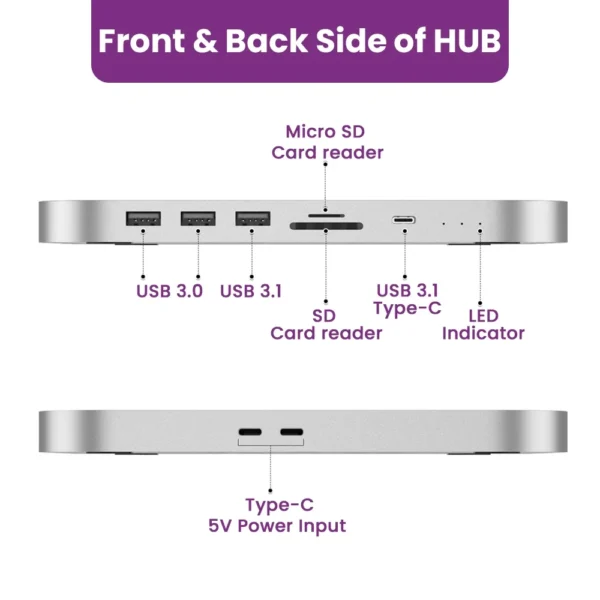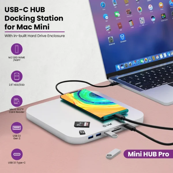 Advanced docking station for Mac Mini with SATA 3.0 for 2.5" HDD/SSD, M.2 NVMe/SATA SSD support, multiple USB 3.1/3.0 ports, SD/micro SD card readers. Comprehensive connectivity solution for storage expansion.