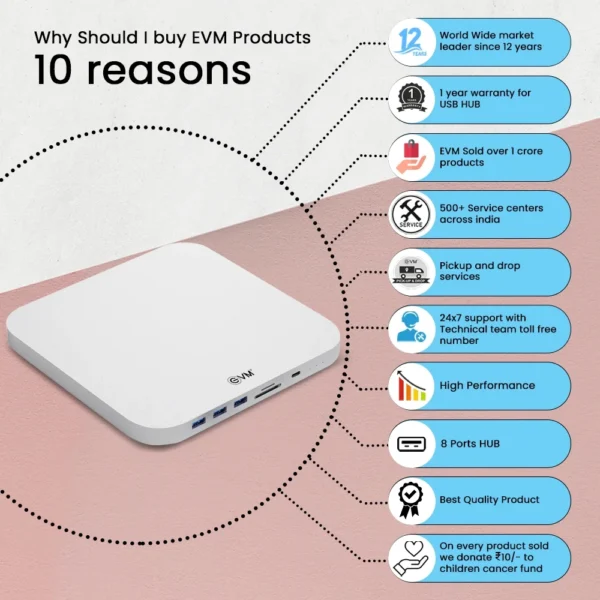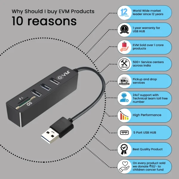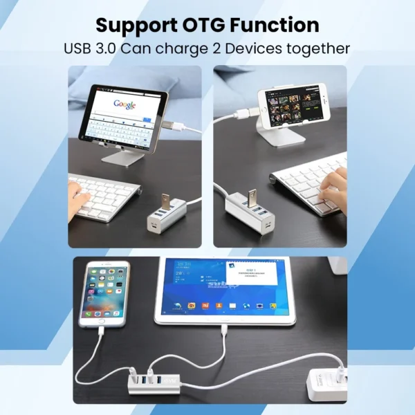4-port USB 3.0 hub with sleek aluminum casing. Data transfer speeds up to 5Gbps, backward compatible with USB 2.0/1.1. Supports external power for connecting high-capacity SSDs/HDDs above 5TB. Wide OS compatibility.