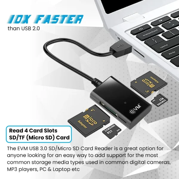 Slots: 4 Dedicated Slots (SD / Micro SD / MS / M2)Performance: USB 3.0 High SpeedCapacity: Supports large capacity cards (up to 512GB+)Usage: Read multiple cards efficiently