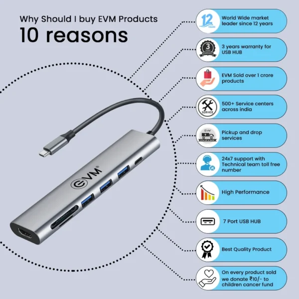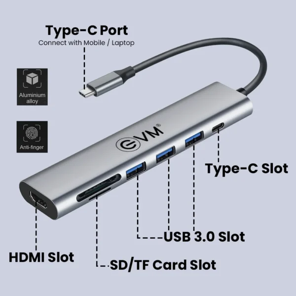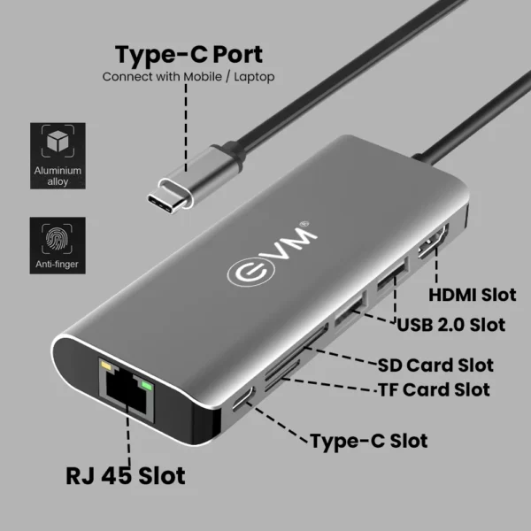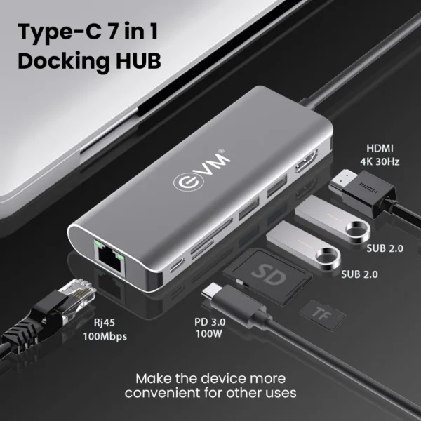 7-in-1 Type-C hub featuring 4K HDMI, 2xUSB 2.0, Ethernet (100M), SD/TF card reader, and 87W PD charging. Aluminum alloy body with plug-and-play operation. Compatible with most Type-C laptops and mobile phones.