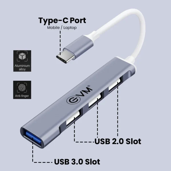 Compact 4-port USB-C hub with 1 USB 3.0 and 3 USB 2.0 ports. Features all-aluminum alloy body, plug-and-play operation, and overload protection. Compatible with Windows and Mac systems. Perfect for expanding connectivity for laptops and mobile devices.
