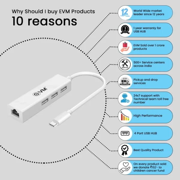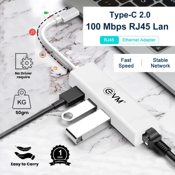 Type-C to 3xUSB 2.0 and RJ45 Ethernet adapter (10/100Mbps). Bus-powered design requires no external power. Supports full and half-duplex transmission. Ideal for adding network connectivity and USB ports to modern laptops.