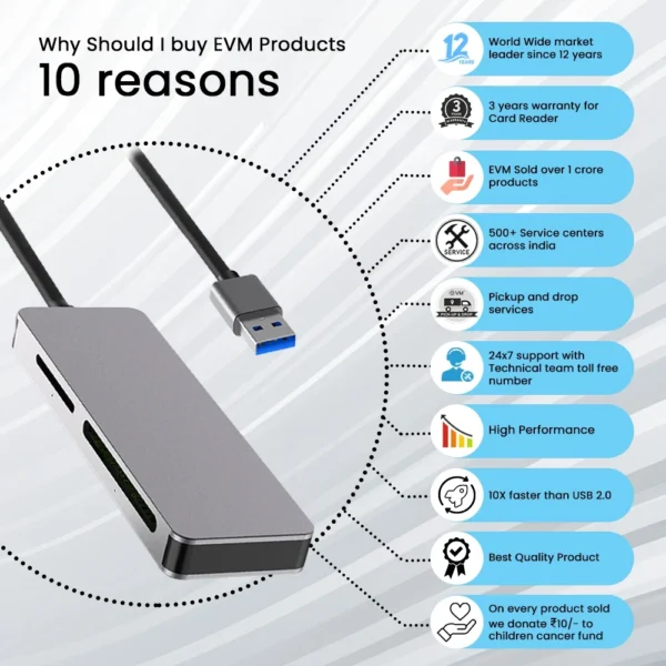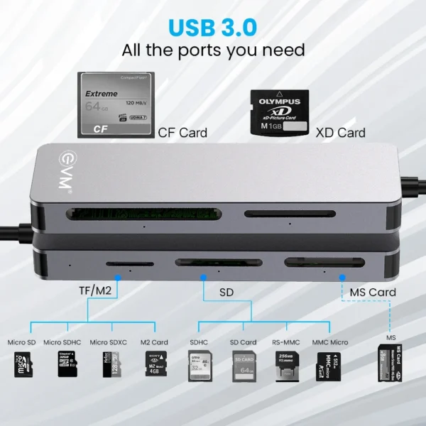 Interface: USB 3.0 (5Gbps Super Speed)Supported Slots: CF, SD, Micro SD (TF), XD, MS, M2Material: Durable Aluminum AlloyCompatibility: Windows, Mac OS, Linux (Plug & Play)