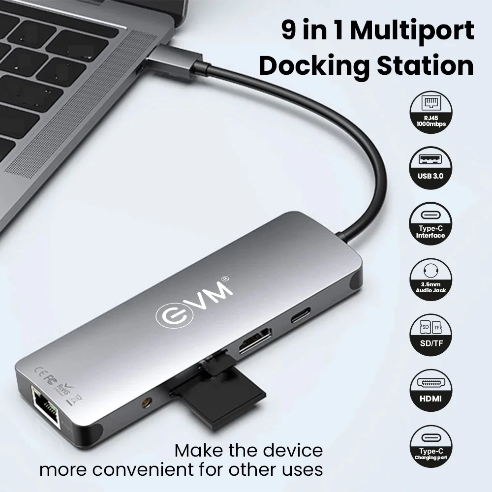 9-in-1 Type-C docking station with 3xUSB 3.0, HDMI 4K, Gigabit Ethernet, SD/TF card reader, audio/mic, and 87W PD charging. Space grey aluminum alloy body with stable performance and quick heat dissipation.