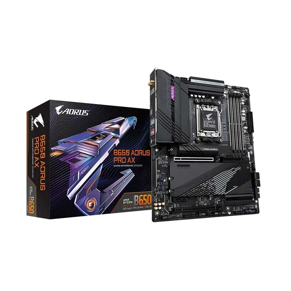 This is the B650 Aorus Pro AX Motherboard for your Desktop Computer: Built for AMD AM5 Ryzen processors. Powered by the AMD B650 chipset, it supports DDR5 memory and integrated WiFi connectivity. Featuring premium VRM design, PCIe 4.0 expansion, multiple M.2 NVMe slots, high-speed USB ports, and advanced thermal solutions, it delivers elite stability and performance for enthusiasts and creators.