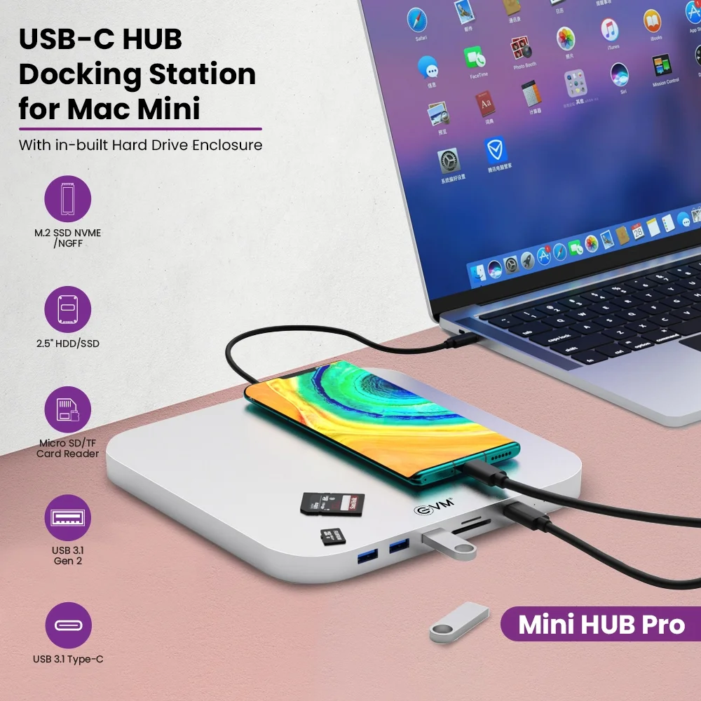 Advanced docking station for Mac Mini with SATA 3.0 for 2.5″ HDD/SSD, M.2 NVMe/SATA SSD support, multiple USB 3.1/3.0 ports, SD/micro SD card readers. Comprehensive connectivity solution for storage expansion.